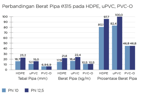PVC-O memberikan alternatif yang lebih efisien. Dengan diameter dalam yang lebih besar, pipa dapat mengalirkan volume air lebih tinggi tanpa harus mengganti diameter nominal. Kapasitas jaringan meningkat, tetapi biaya tidak ikut naik.